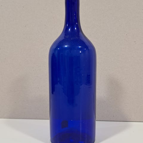 Koristeeksi sininen lasipullo, kapea ja pitkä muoto. Pullo on valmistettu sinisestä lasista ja siinä on puinen korkki.