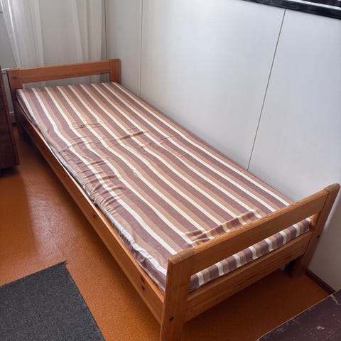 Mäntypuinen, sälepohjainen sänky. Pinnoilla on jonkin verran käytönjälkiä. Päädyt ovat kauniit. Sänkyjä on myynnissä kaikkiaan 3 kappaletta. Hinta on sänkyä kohden.