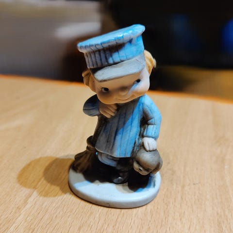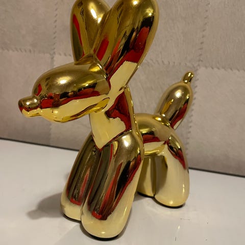 Pieni koristeellinen koirahahmo, mahdollisesti messingistä tai kullatusta metallista.