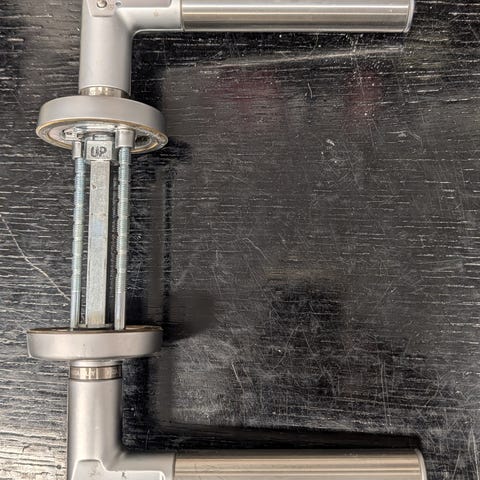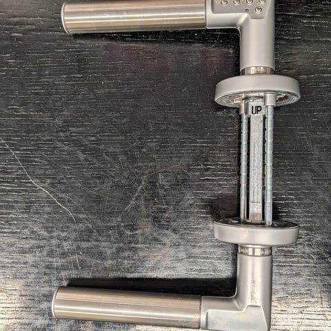 Tuntematon ovipainike ruostumateriaalista, valmistettu ruostumattomasta teräksestä. Ovipainikkeen muotoilu on suorakulmainen ja siinä on useita reikiä tai pisteitä. Sopii ovien avaamiseen ja sulkemiseen.