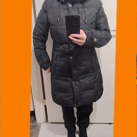 Musta hyväkuntoinen polvipituinen untuvatakki.Irroitettava huppu.