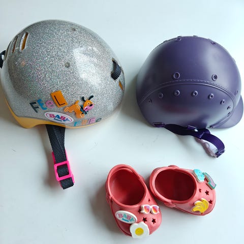 Baby Bornille pyöräilykypärä, pinkit sandaalit / korkokengät ja tossut. Kypärän pääliosassa naarmuja ja tossun pohjissa tummentumaa, muuten siistissä kunnossa.