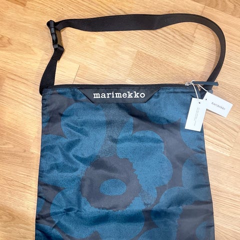 Marimekko Neat Crossbody M Unikko tummansininen/luonnonvalkoinen olkalaukku. Laukku on valmistettu ohuesta kierrätetystä 100 % polyesteristä ja siinä on ikoninen Unikko-kuviointi. Laukussa on säädettävä olkahihna ja vetoketjusuljenta. Sisäpuolella on pieni avoin tasku, johon koko laukun voi taitella säilytystä varten. Laukun mitat ovat korkeus 40 cm, leveys 29 cm, syvyys 10 cm, kantohihnan pituus 115 cm. Laukku uusi, laput kiinni.