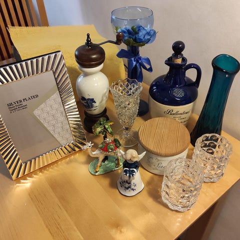Kokoelma erilaisia koriste-esineitä ja astioita, sisältäen lasisia kynttilänjalkoja, keramiikkaesineitä, koristeellisia lautasia ja muita pieniä koristeita. Nouto Salosta. Ei postitusta.