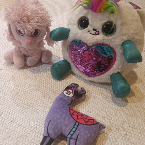 Markkinoilta ostetut pehmot 4kpl. Yhdellä jalka repsottaa. Käytettyjä, nyppääntyneitä ja kulumaa.
