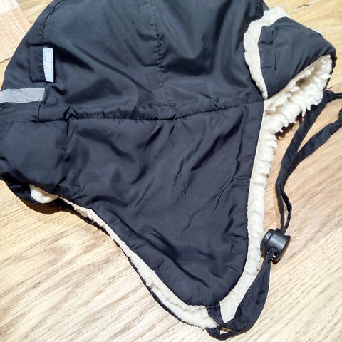 Ihana ruskea tupsuilla oleva talvihattu. Sisällä fleecevuori. Kokomerkintä one size. Arvioin, että sopiva alle vuoden ikäiselle. Olemme lemmikkitalous.
