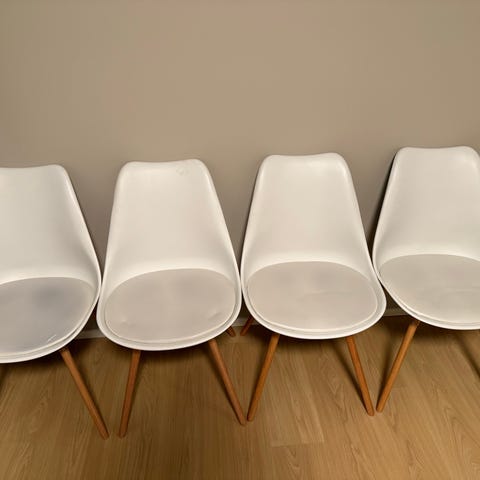 Tuolit ovat kohtalaisessa kunnossa lähinnä kankaassa olevien tahrojen vuoksi, jotka saa pestyä kuvassa näkyvällä, ja kaupassa mukana tulevalla pesunesteellä. Kunto siis huomioitu hinnassa. Muutoin tuolit ovat kunnossa: kangas on ehjää eivätkä jalat lenkkase.