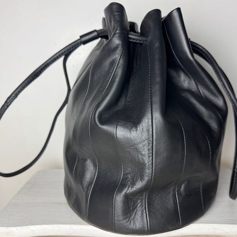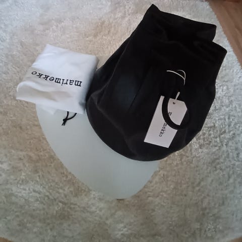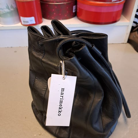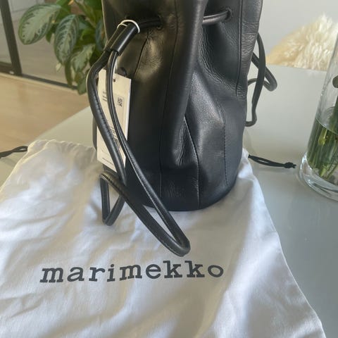 Marimekko musta Iso Keira laukku. Laukku on valmistettu nahasta. Tilavassa laukussa on pitkät olkahihnat, joissa on stoppari ja joita vetämällä laukun saa kiinni. Laukku on sisältä vuoritettu ja siellä on yksi vetoketjutasku. Tuotteen vuorimateriaali on valmistettu 100-prosenttisesti kierrätetystä polyesterista. Leveys 37 cm, korkeus 30 cm, syvyys 24 cm. Laukku uusi, käyttämätön, lappu kiinni, mukaan laukun oma dust bag.