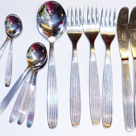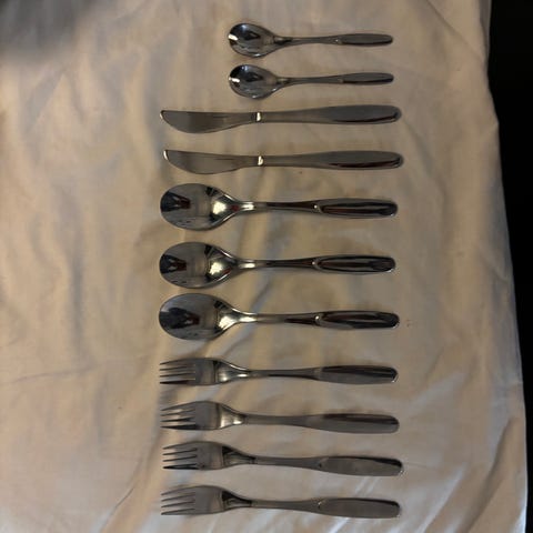 Kuvan mukaiset ruostumattomasta teräksestä valmistetut aterimet, veitset kahta kokoa ja haarukat. Kaikki yhteensä 35e.