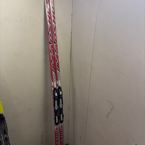 Madshus Omega 170 cm hiihtosukset nnn siteillä ja 120cm sauvoilla. Sukset ovat sinivalkoiset ja sauvat punaiset. Perinteisen hiihdon paketti