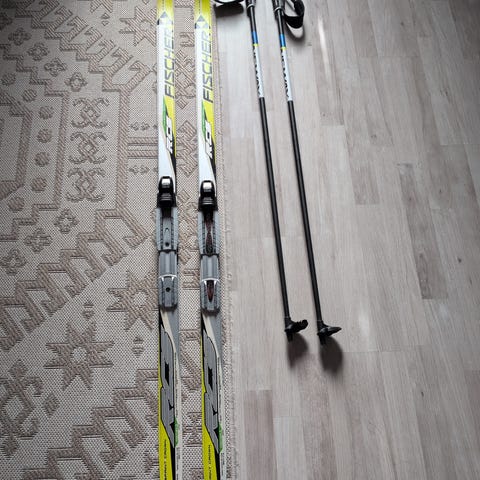 Perinteisen hiihtoon lapselle 150cm sukset sekä 125cm sauvat. Suksien päät hiukan irvistää, lisäkuvat. Ei vaikuta hiihtämiseen.