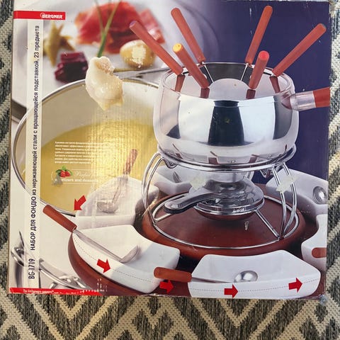 Myydään alumiininen emalipintainen käyttämätön, konepestävä Tefal fondue-setti. Ohjekirja englanniksi.