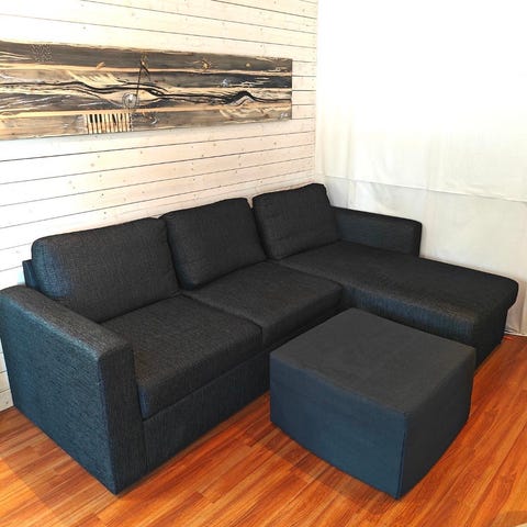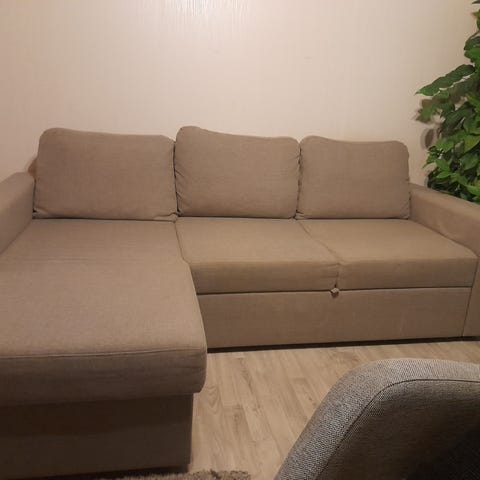 Divaani vuodesohva, divaanin puolta voi vaihtaa. Leveys 250, syvyys 90 ja divaanin syvyys 160.