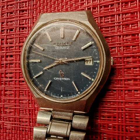 Ruskealla kellotaululla vintage Citizen Crystron Quartz rannekello.