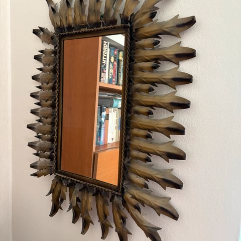 Kaunis vanha puinen aurinkopeili. Kuvien mukainen. Takaa löytyy ripustuskoukku. Halkaisija 62cm. Ihan ok kunto, ei ole paloja irti. Kolmannessa kuvassa on minun mielestäni totuudenmukaisimmat värit.