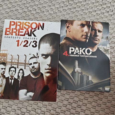 Prison Break DVD-levyt sisältävät televisiosarjan kaudet 1-4. Kaudet 1-3 suomenkielisessä paketissa ja kausi 4 ruotsinkielinen paketti, mutta kaikissa tekstitykset myös suomeksi. Pahvisissa pakkauksissa kulumisen jälkeä, mutta itse muovikotelot ja DVD:t ehjiä