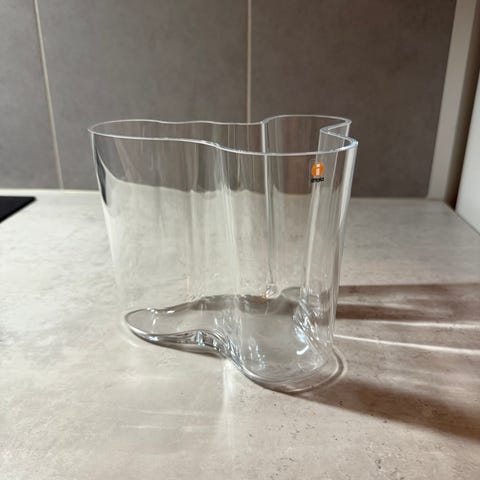 Iittala maljakko sinisessä värissä. Maljakko on valmistettu lasista ja siinä on aaltoileva muotoilu.Yläreunassa pienen pieni jälki.