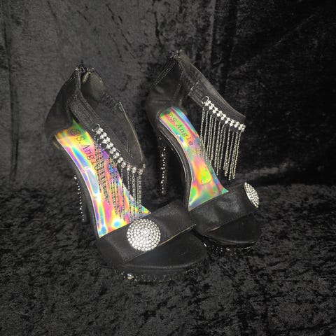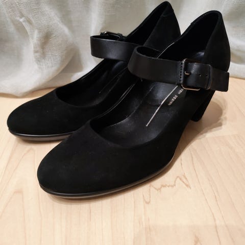 Kotimaiset korkokengät, koko 35, musta väri. Kengissä on kolme koristelistaa ja napit päällä. Korko on noin 6 cm korkea. Nahka.