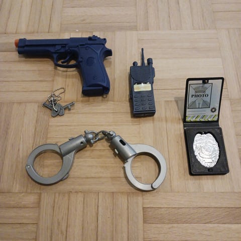 Settiin kuuluu taskulamppu(toimiva), pamppu, liivi, merkki, ase, radiopuhelin ja käsiraudat. Pampussa pari pientä painaumaa. Aseesta kuuluu pieni ääni ammuttaessa.
