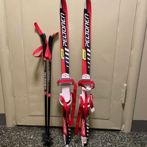 Myydään pakettina kenkiin kiinnitettävät Peltonen sonic step -sukset (90cm) ja sauvat (70cm). Taulukon mukaan pituudet sopivat noin 90-cm pituiselle pienelle hiihtelijälle.