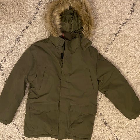 Pitkä vuorellinen toppatakki. Irrotettava huppu. Helman sivuosassa painonapit.