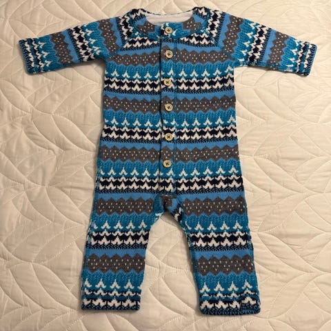 Reima villasekoitehaalari sinivalkoisilla kuvioilla, koko 68/74 cm. Materiaalina 50% villaa ja 50% akryyliä. Uutena ostettu ja ehkä kerran käytetty eli todella siistissä kunnossa.