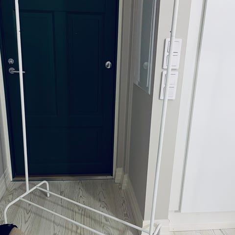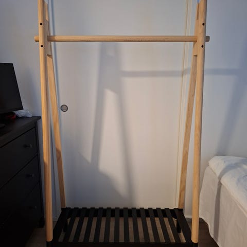 Otsikon mukainen teline myynnissä. Kenkätasosta pari rimaa poikki (toinen kuva) mutta muuten hyvässä kunnossa.