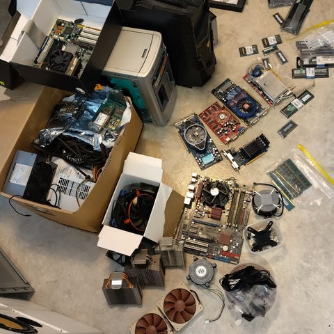 Erilaisia vanhoja PC-osia – mm. RAM, CPU ja kotelo