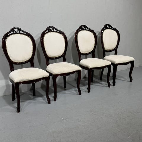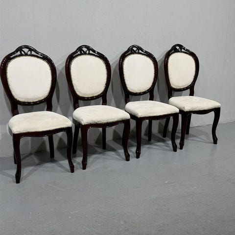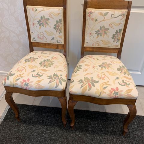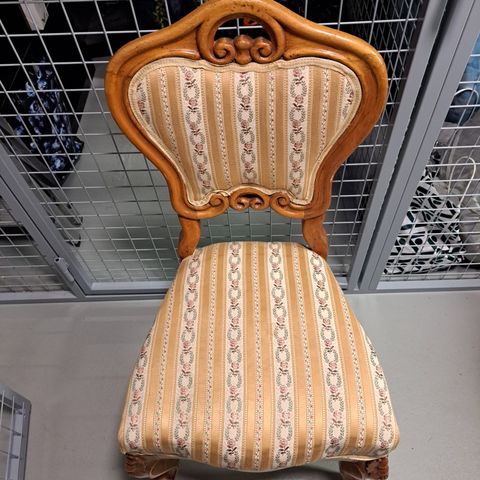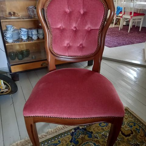 Kuvan mukaisia rokokoo tuoleja löytyy 4kpl. Kuvissa näkyy vain yksi näistä, koska en halunnut kaivaa kaikkia esille varastosta. Jousitus on näissä ok kunnossa. Puuosien kunto myös ok, antiikkihuonekalun kunto. Jotain pientä naarmua on jos syynää, ei mitään silmään pistävää. Kestävät hyvin istumista.
