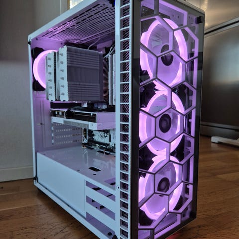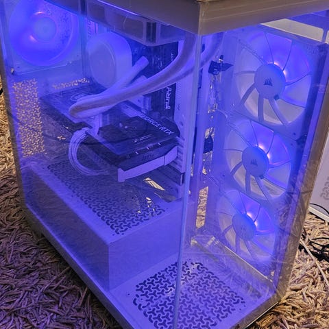 Hieno valkoinen pelitietokone, jossa on rgb valot joitten väriä voi vaihtaa miksi väriksi vaan.