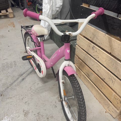 Jupiter lastenpyörä, jossa 16 tuuman renkaat. Pyörän runko on valkoinen ja siinä on pinkkejä yksityiskohtia. Pyörässä on takalokasuoja, tavarateline ja heijastimet. Sopii lapsille, jotka käyttävät 16 tuuman pyöriä. Pinnapillit saavat pois jos haluaa.