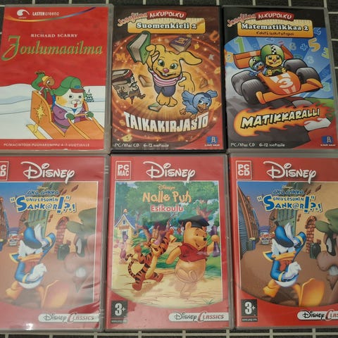 Lasten pc pelejä. Siistejä ja hyväkuntoisia. Olleet pidempään jo varastoituina. Nyt en ole testannut näitä, joten hintakin on kohtuullinen. Kaikki 20 e.