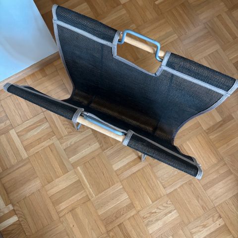 Metallinen runko, puinen kahva ja kangastaskut. Sopii hyvin sanoma- ja aikakauslehdille tai vaikka postille. Helppo siirtää ja vie vähän tilaa.
