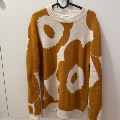 Myyntiin Marimekon Kotva talkoot neule. Väri sinikirjo. Koko L, mutta mitoitus pienempää.