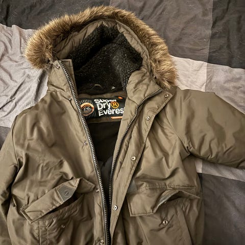Miesten hyväkuntoinen parkatakki, irrotettava hupun karvareunus, paljon taskuja, myös yksi sisätasku, fleece- ja tikkivuori, hihoissa aplikoidut merkit.