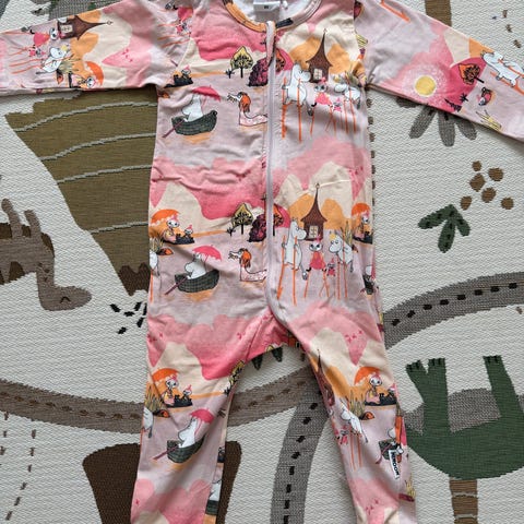 Moomin by Martinex lasten pyjama, koko 80, valmistettu puuvillasta. Keltaisen ja oranssin sävyjä ja Muumi-aiheinen kuosi. Käytetty kunto.
