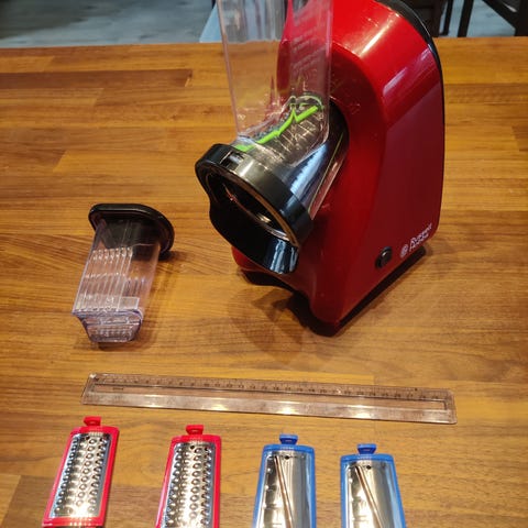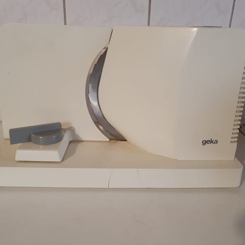 Pieni helppokäyttöinen laite esim. lihan leikkaamiseen siivuiksi. Terä on terävä. Moottori toimii. Moderni pistoke. Postitus (11e) tai haku. Kulkee metrolla keskustaan saakka.