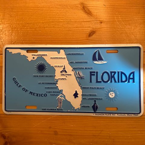 Floridasta ostettu puinen (vaneri?) taulu, jossa maalattu tai tulostettu kuva ja takana metallinen kiinnityskoukku. Hyvin vähäistä kulumaa, joka itse asiassa ei haittaa (vaikka olisi enemmänkin) rantsuviboja tuovaan kylttiin.