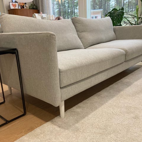 Myynnissä Veken Classic avokulmasohva. Classic sohva on nimensä mukaisesti ajaton valinta. Sen selkeälinjainen muotoilu, sirot käsinojat ja korkeat jalat luovat ilmavan ilmeen, joka sopii täydellisesti skandinaavisiin koteihin. Korkeat jalat helpottavat myös siivousta sohvan alta. Sohvan runko ja jouset ovat ehjät. Istuin ja selkätyynyjen kankaat ovat irrotettavissa pesuun. Sohvan selkätyynyt ovat rungossa kiinni vetoketjulla. Istuintyynyt tarrakiinnityksellä. Tämän ansiosta tyynyt pysyvät loistavasti paikoillaan käytössä, eivätkä pääse valahtelemaan. Sohvassa avokulman puolisuus kuvien mukainen. Ei vaihdettavissa. Sohvassa ei ole vuodeominaisuutta. Huomioitavaa sohvan kunnossa: Sohva on ollut koirataloudessa. Istuintyynjen alle jäi puhdistuksesta huolimatta melko runsaasti koirankarvoja. Emme lähteen koirankarvoja teippiharjaamaan, emmekä yksi kerrallaan nyppimään. Lisäksi uutta etsivä voi jotain aivan minimaalisen pientä käyttötummumaa löytää. Kyseiset virheet huomioitu hinnassa rankalla kädellä. Sohvan yleisilme siisti. Sohvaa kannattaa tulla paikanpäälle katsomaan!!! Sohvan hinta: 489e