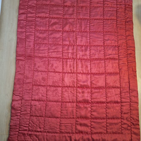 Kaunis vintage silkkitäkki kullan/oranssin sävyssä. Täkissä on näyttävä, kaarteleva tikkauskuviointi ja upea kiilto, joka tekee siitä sekä käyttö- että sisustuselementtinä todella näyttävän.