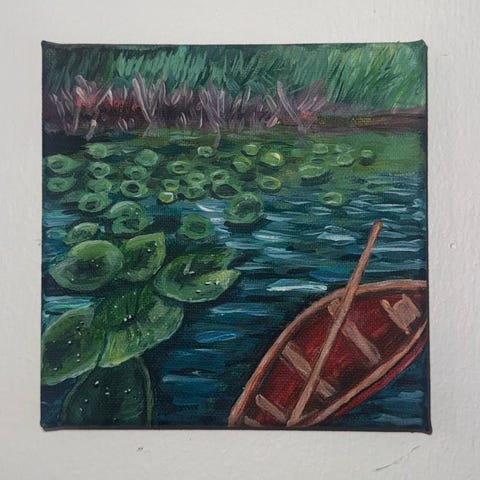 Taidemaalaus, jossa on kuva lammaseläimestä ja suuresta punaisesta omenasta. Maalaus sisältää tummia ja vaaleita sävyjä, ja siinä on taustalla pilvinen taivas. Maalailin itse joskus alaikäisenä.