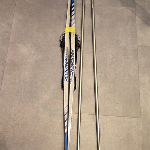 Peltosen perinteisen sukset Salomon sns-siteillä. Pituus 174 cm, leveys 4,3 cm Jalaksen monot kokoa 39 saa halutessa kaupanpäälle.