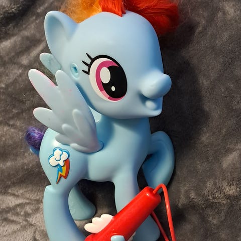 Hyväkuntoinen ja ehjä laulava poni. Laulaa osia kappaleesta ”Glowing Up!” Kun painaa jalassa olevaa nappia. Siivet heiluvat kun jalkoja painaa yhteen. Muutama pieni mukana tullut osa (hiuspinni ja sormus) hukassa.