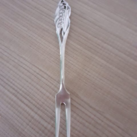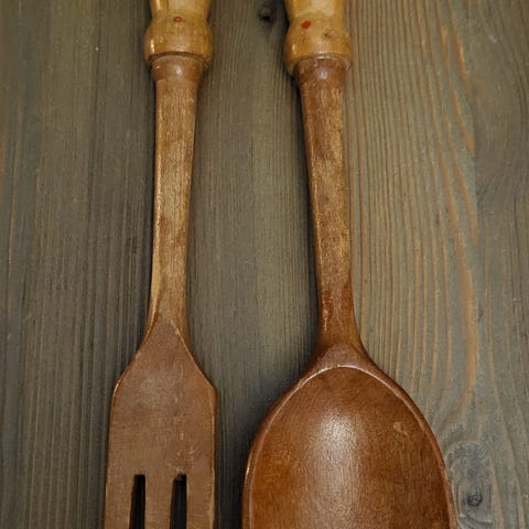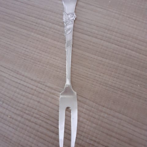 Kaksi vanhaa leikkelehaarukkaa. Varsi muovia, terä metallia. Lienevät 1970-luvulta.