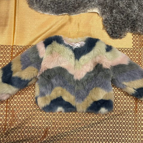 Pikkuneidille itsetehty pitkä turkki tikkivuorilla, 98 koko, huppu ja napit, mukaan saa samasta kankaasta tehdyn lakin. Vas hihansuussa tummentuma. 20e+pk