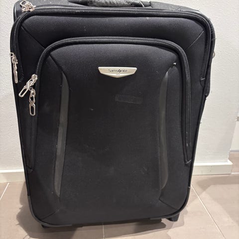 Toimiva matkalaukku. Kahvan kiinnitysruuvin suojakuori on rikki, muuten ehjä. Sisätiloissa on taskuja ja tilaa vaatteille ja muille tarvikkeille. Laukun kahvassa on teleskooppivarsi vetämistä varten. Lisään mitat myöhemmin, jos ei vielä näy ja kiinnostaa, niin kysy.