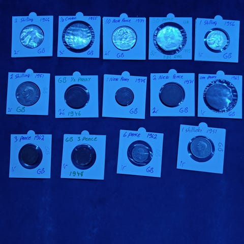 Sekalainen kokoelma kolikoita eri arvoilla ja materiaaleilla. Kolikot vaihtelevat kooltaan ja ulkonäöltään, sisältäen sekä hopeanvärisiä että kuparinvärisiä kolikoita. Vuodelta 1800-2000 luvun