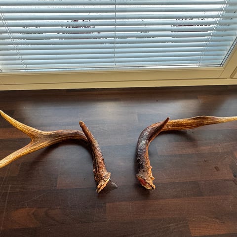 Ruskeaksi petsatut peuran sarvet kallossa.