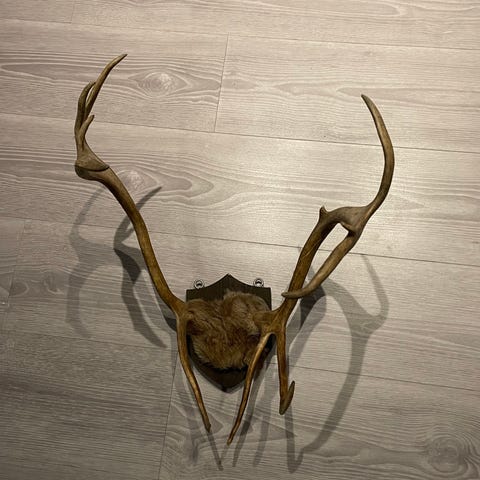 Ruskeaksi petsatut ja lakatut peuran sarvet kallossa.