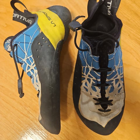 Uudet ja käyttämättömät miesten koon 39,5 kiipeilykengät joko sisäseinille, bouldereille tai kallioille. Eivät olleet sopivan kokoiset sovituksen jälkeen ja jäivät varastoon. Paketti kokenut kovia joko yrityksen varastossa tai toimituksessa, mutta yhtä kaikki alkuperäinen laatikko mukana. Profiili on vähän alas taivutetut, sopivat passelisti esimerkiksi tarkkuutta vaativille reiteille ja otteille.